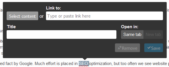 • You can now add links to internal content items in the Online Editor, decide in which tab the link should open, and set link title: